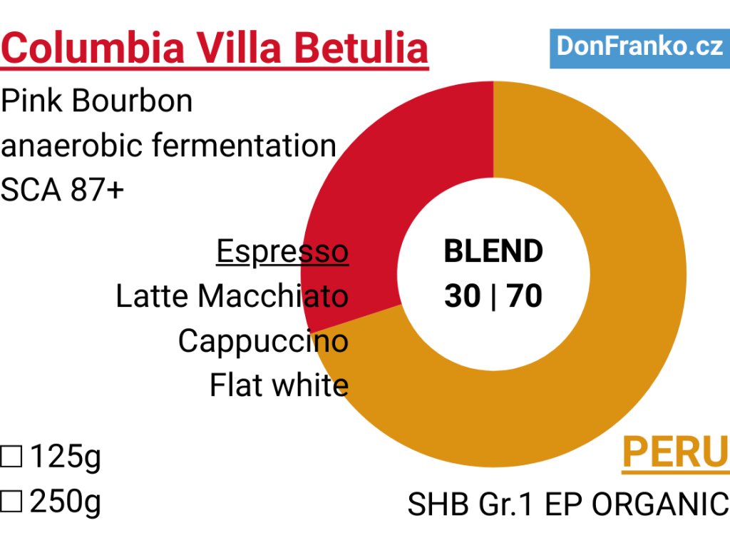Anaerobně fermentovaná Columbia Villa Betulia Pink Bourbon (hodnocení SCA 87,5) smíchaná s kvalitní arabikou PERU SHB Gr.1 EP ORGANIC v poměru 30/70.